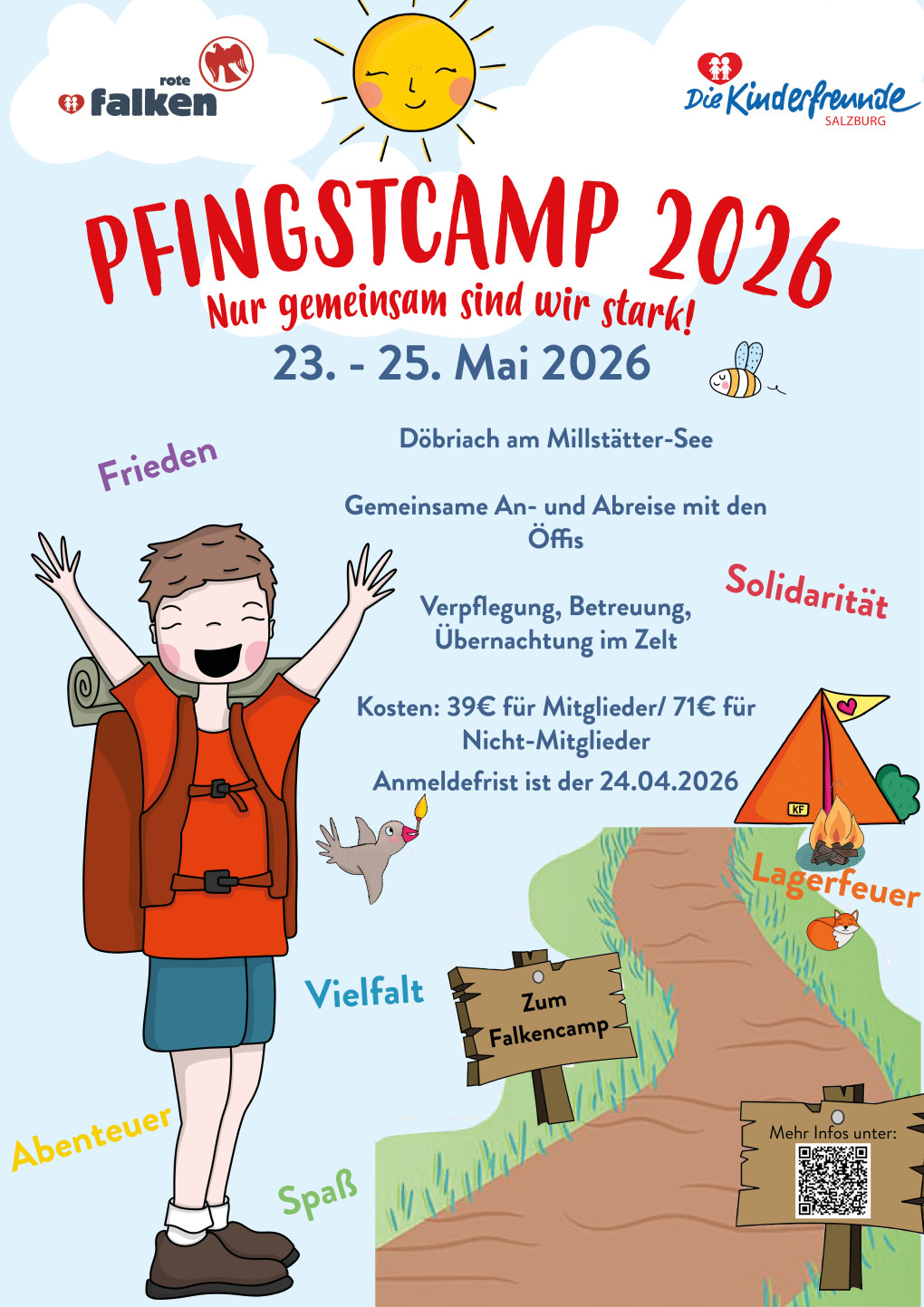 Im Mai 2026 ist es wieder soweit: Das große österreichweite Bundespfingstlager der Kinderfreunde und Roten Falken steht vor der Tür! Vom 23. Mai bis 25. Mai wird in Döbriach am Millstätter-See ein spannendes Wochenende mit einer Vielzahl an Aktivitäten und Gemeinschaftserlebnissen stattfinden. Gemeinsam wollen wir drei Tage voller Action, Outdoor-Aktivitäten, Gruppenspielen und unvergesslicher Momente erleben.