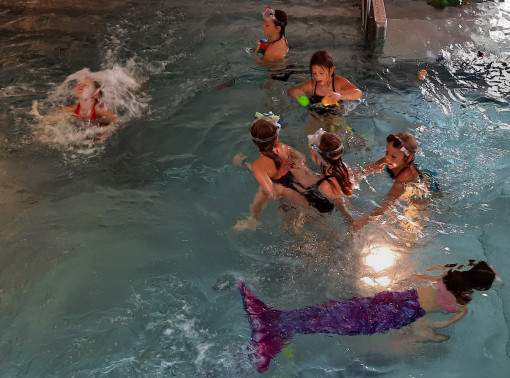 Neben gemeinsamen Spielen wie Wasser-Basketball, Wasserball, Tauchparcours und Fang-Spielen hatten die Kinder genug Zeit für freies Schwimmen, Spielen und gemütliches Jausnen auf den Liegestühlen. Auch heuer tummelten sich wieder zahlreiche, bunte Meerjungfrauen im Wasser.
