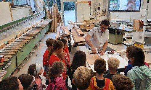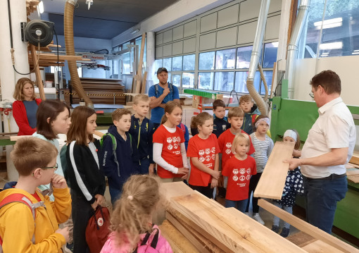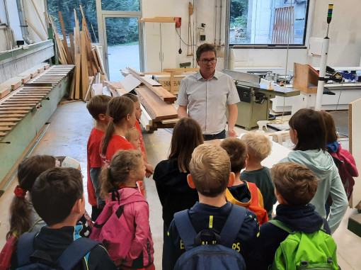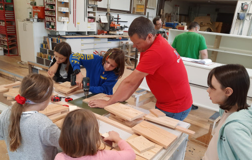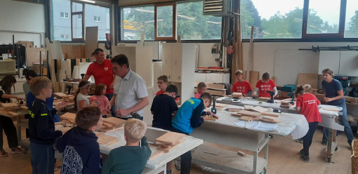 Diese Woche durften wir die Tischlerei Stöllnberger besuchen. Tischlermeister Günther Stöllnberger erklärte uns Interessantes über verschiedene Holzarten und deren Verarbeitung. Dann ging es ans Werken, alle waren mit Begeisterung dabei. Gemeinsam wurde gemessen, gebohrt, geschliffen und geschraubt, die Kinder unterstützten sich dabei gegenseitig.