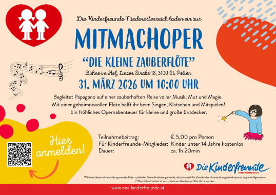 Die Kinderfreunde Niederösterreich laden zur Mitmachoper „Die kleine Zauberflöte“ in die Bühne im Hof ein.