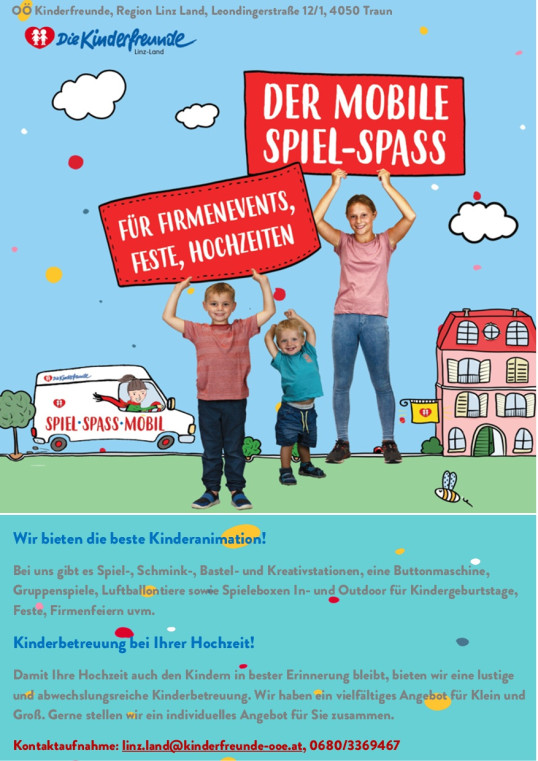 Ihr seid auf der Suche nach einer liebevollen, professionellen Kinderbetreuung für euer Firmenevent, eure Hochzeit, euren Geburtstag? Wir stellen ein individuelles, passendes Angebot für Sie zusammen! Kontaktieren Sie uns gerne unter: linz.land@kinderfreunde-ooe.at