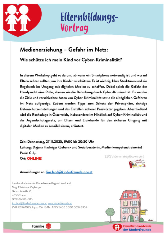Am 27.11.2025 findet ein ONLINE Vortrag zum Thema "Medienerziehung" über das Regionsbüro der Kinderfreunde Linz Land statt.