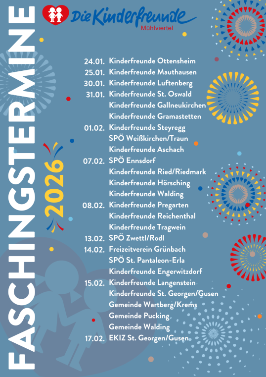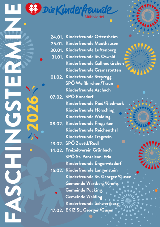 Auch heuer ist die Faschingsanimation der Kinderfreunde Mühlviertel wieder im gesamten Mühlviertel unterwegs. Im Mittelpunkt stehen dabei nicht nur Spiel, Spaß und gute Laune für Kinder, sondern auch die Werte, für die die Kinderfreunde seit jeher stehen: Freiheit, Gerechtigkeit, Gleichheit, Frieden, Solidarität und Vielfalt.