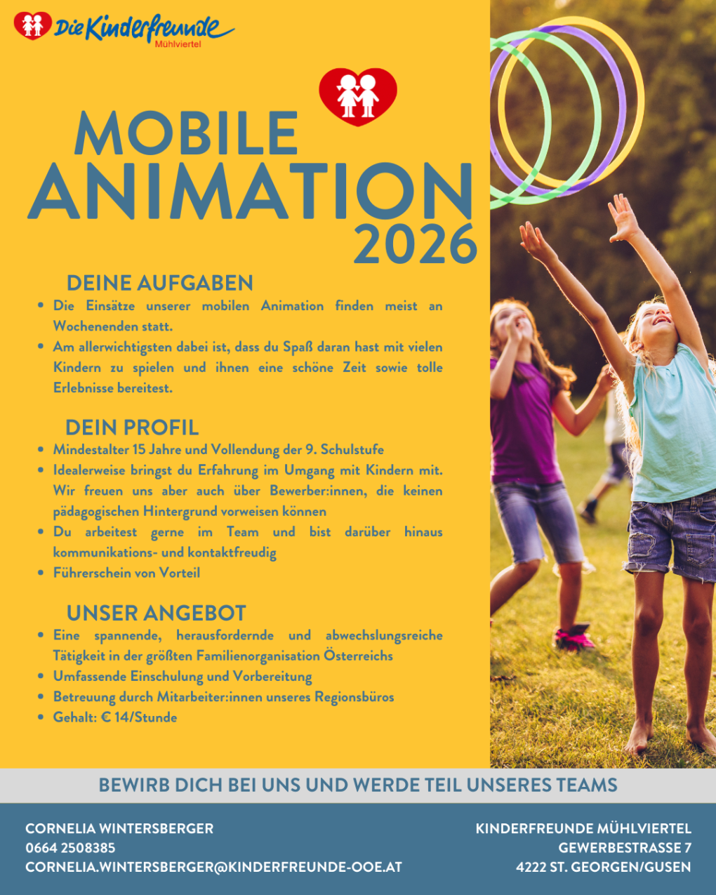 Du bist voller Energie, kreativ und hast Spaß an der Arbeit mit Kindern? Dann bist du bei uns genau richtig! Für die Sommerferienbetreuung 2026 suchen wir motivierte Mitarbeiter:innen an verschiedenen Standorten im ganzen Mühlviertel.