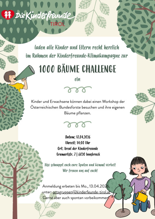 im Rahmen der Kinderfreunde-Klimakampagne wollen wir alle gemeinsam auf der Hungerburg so viele Bäume wie möglich pflanzen. Alle Kinder und Erwachsene der Kinderfreunde Ortsgruppen sowie alle Kinder und Eltern des Kinder- und des Jugendtreffs sind herzlich dazu eingeladen mitzumachen und ihre eigenen Bäume zu pflanzen!