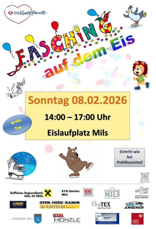 Die Ortsgruppe Mils lädt euch am Sonntag, 08.02.2026 von 14:00 - 17:00 Uhr zum Fasching auf dem Eis beim Eislaufplatz Mils ein.