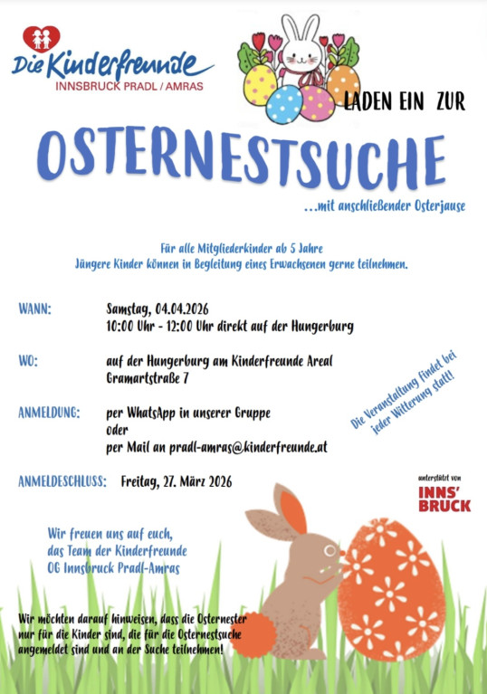 Die OG Pradl-Amras lädt zur großen Osternestsuche, am 4.4.2026, von 10:00-12:00 Uhr, auf dem Hungerburg Gelände ein.