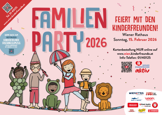 Am Sonntag, 15. Februar, veranstalten die Wiener Kinderfreunde die Familienparty im Rathaus (Eingang Lichtenfelsgasse 2). Der Einlass beginnt um 13:30 Uhr, das Vorprogramm auf der Showbühne mit Moderator Robert Steiner startet um 14.30 Uhr. Geboten werden tolle Mitmachspiele sowie ein lustiges Bühnenprogramm mit Musik, Tanz & Shows; u.a. "Warm Up" Faschingsanimation, Kinderliedermacher Bernhard Fibich, die Verlosung von tollen Preisen (Lose gibt’s für jede gekaufte Kinder-Eintrittskarte beim Einlass)! Schon ab 14:00 Uhr sind unsere abwechslungsreichen Aktivitätsstationen in den Sälen geöffnet.