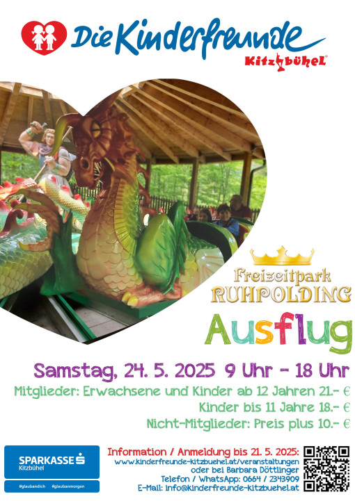 Am Samstag, 24. Mai 2025 laden die Kinderfreunde Kitzbühel zum Busausflug in den Freizeitpark Ruhpolding. Abfahrt ist um 9 Uhr beim Pfarrauparkplatz in Kitzbühel. Zustiege unterwegs sind möglich. Voraussichtliche Rückkehr ist um 18 Uhr.