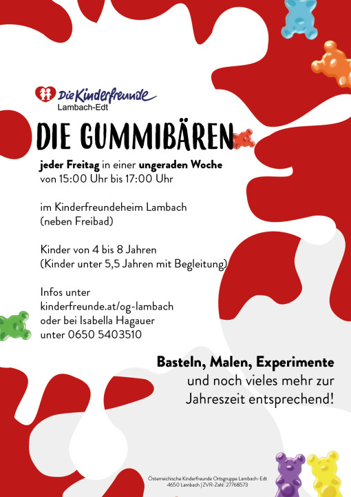 "Die Gummibären" ist eine neue Spielgruppe die mit 05.12.2025 startet und an jedem Freitag in einer ungeraden Woche von 15:00 Uhr bis 17:00 Uhr im Kinderfreundeheim stattfindet. Zielgruppe sind Kinder von 4 bis 8 Jahren. Kinder unter 5,5 Jahren sollten mit Begleitperson erscheinen. Erwarten wird die Kinder Basteln, Malen, Experimente und noch vieles mehr zur Jahreszeit entsprechend.