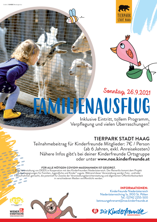 Wir laden wieder herzlich zum Familienausflug ein. Dieses Mal geht's in den Tierpark Stadt Haag, einem Ort der Begegnung von Mensch und Tier. Wir haben uns wieder ein tolles Programm für euch ausgedacht und es gibt viele Überraschungen für alle Kinderfreunde-Mitglieder-Familien in Niederösterreich. Die Kosten betragen 7 Euro pro Person (ab 6 Jahren).