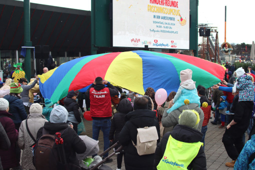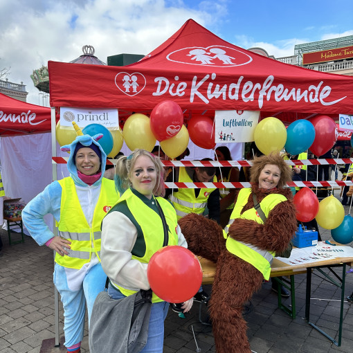Vor dem Umzug: Kinderanimation mit dem Spielbusteam, Aktivstationen wie z.B. Luftballons, Buttons machen, wasserlösliche Kinderrechte-Tattoos, Musik, u.a.