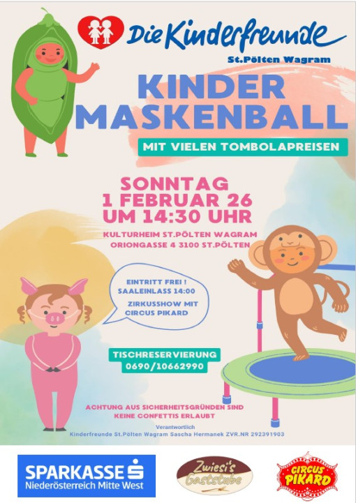 Die Kinderfreunde St. Pölten Wagram laden am Sonntag, 1. Februar 2026, zum Kindermaskenball ins Kulturheim St. Pölten Wagram ein. Ab 14:30 Uhr erwartet die Kinder ein buntes Programm mit vielen Tombolapreisen und einer speziellen Zirkusshow vom Circus Pikard. Der Eintritt ist frei, Saaleinlass ist ab 14:00 Uhr. Aus Sicherheitsgründen ist das Mitbringen von Konfetti nicht erlaubt. Tischreservierungen sind telefonisch möglich.