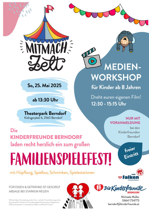 Am Sonntag, dem 25. Mai 2025 ist es endlich so weit – die Kinderfreunde Berndorf laden zum großen Mitmachzelt im Theaterpark Berndorf (Kisingerplatz 6, 2560 Berndorf) ein! Ab 13:30 Uhr erwartet euch ein kunterbuntes Programm mit Spiel, Spaß und Action für die ganze Familie.
