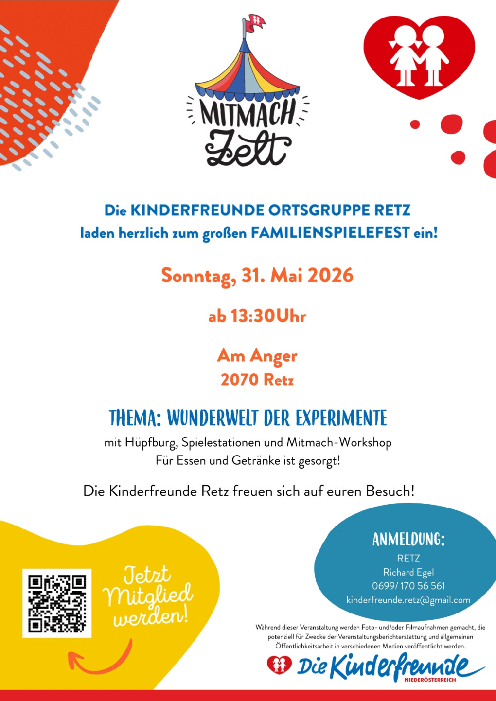 Am Sonntag, dem 31. Mai 2026 ist es so weit – die Kinderfreunde Retz laden zum Mitmachzelt ein!