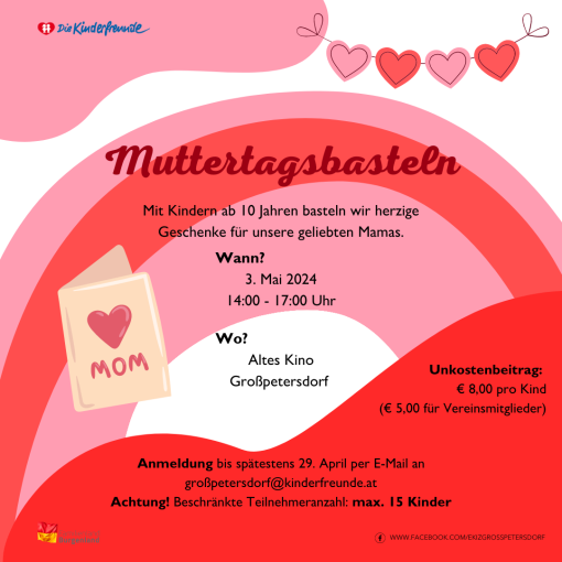 Alle Kinder ab 10 Jahren sind am Freitag, 3.Mai herlich ein zum Muttertagsbasteln im Alten Kino einladen. Aber seid schnell!!! Es gibt nämlich nur eine begrenzte Anzahl an Plätzen!!! Um gemeinsam bezaubernde Geschenke für unsere geliebten Mamas zu basteln, bitten wir euch bis spätestens 29.April anzumelden.