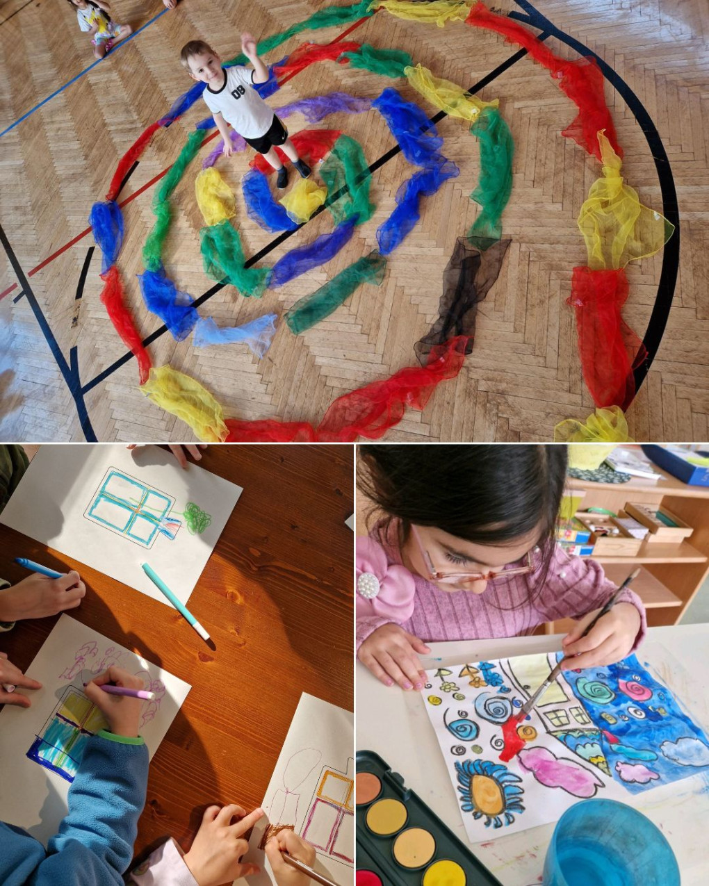 Zurück im Kindergarten haben die Kinder all das in ihre eigenen Kunstwerke mitgenommen: viel Farbe, viele Bögen, viele Bäume – und ganz viel Freude am Gestalten. 😍 Besonders die Spirale hat viele Kinder begeistert – sie tauchte immer wieder in Gesprächen, in Zeichnungen und schließlich als große Spirale aus Tüchern im Turnsaal auf. 🌀