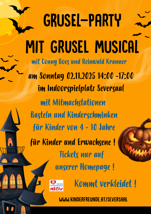 - Sonntag, 2.11. von 14:00 bis 17:00 Uhr: Grusel-Party mit Mitmachstationen ab 14 Uhr und dem Grusical "Fürchtet euch (nicht)!" um 16 Uhr. Tickets bitte vorher hier online buchen!